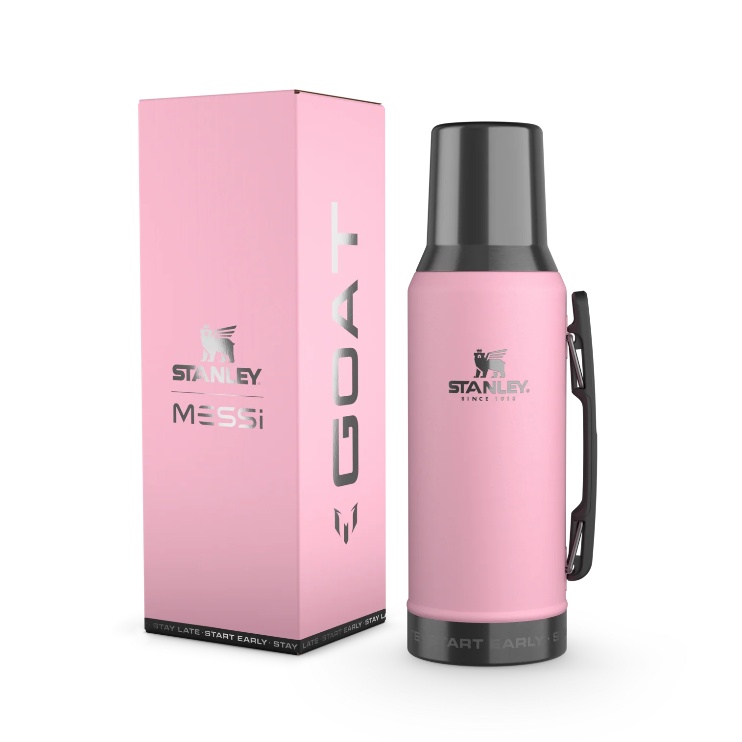 Start early, stay late with the Messi x Stanley GOAT Collection. The 1.3-quart High Precision Flow Mate System features a unique stopper. No twisting needed as the trigger button gives you a continuous pour. Shaped like a mate gourd, the insulated lid doubles as a mug so you can fuel your dedication on and off the pitch.