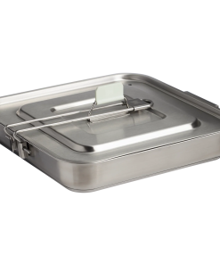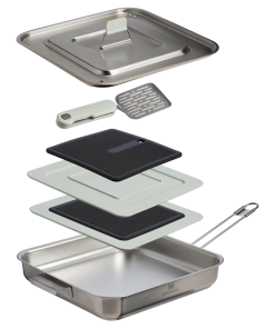 The 5-piece Wildfare Pro Square Pan Cookset is a camping cookware set that gives you more space to be creative. Made of tri-ply bonded stainless steel for even heating, the pan is squared to maximize your cooking area, and has a folding handle. The vented lid is also a strainer. Packed for efficiency, a nonslip cutting board with removable trivet and folding stainless steel spatula nest together, so you can create delicious meals outdoors.